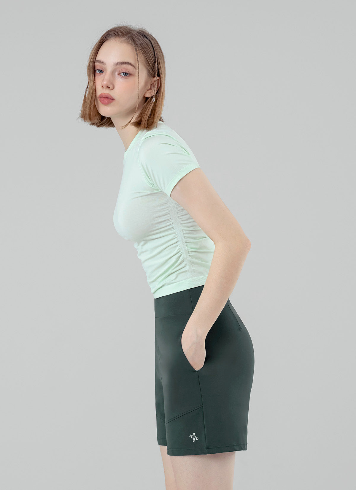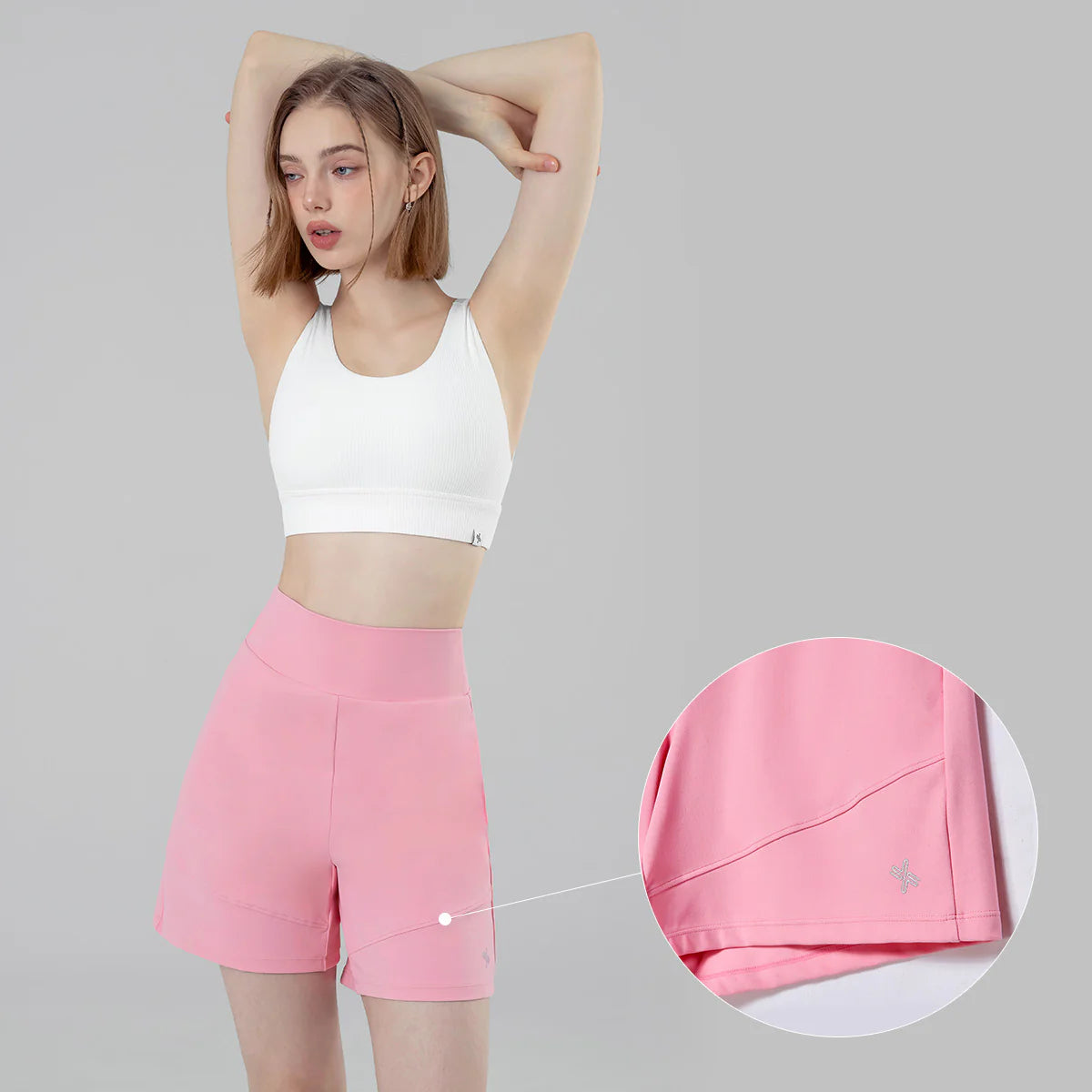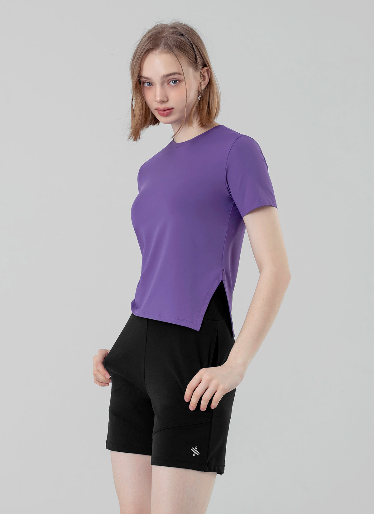 Diagonal seam lines at the front hem visually elongate and slim the legs, enhancing your natural shape.