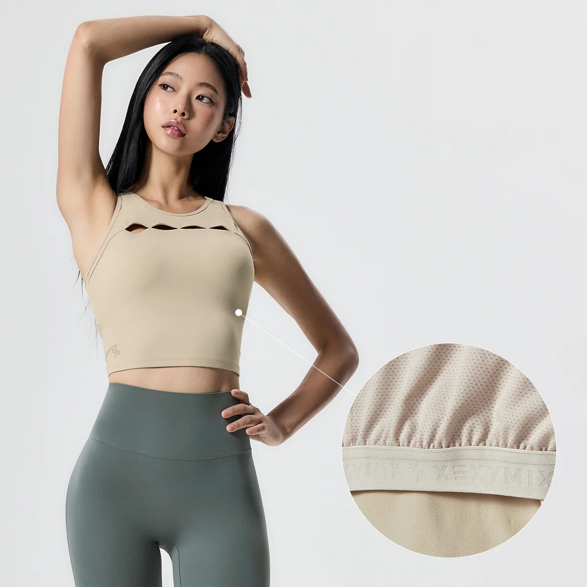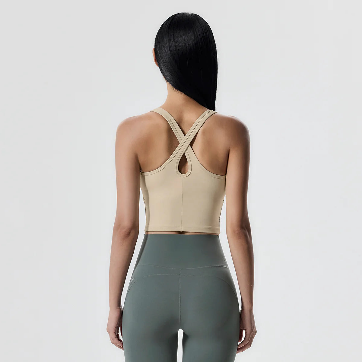 The X-back design allows full freedom of movement without restricting the shoulder blades, making it easy to observe back muscle activity during workouts. A teardrop-shaped cutout at the center enhances breathability.