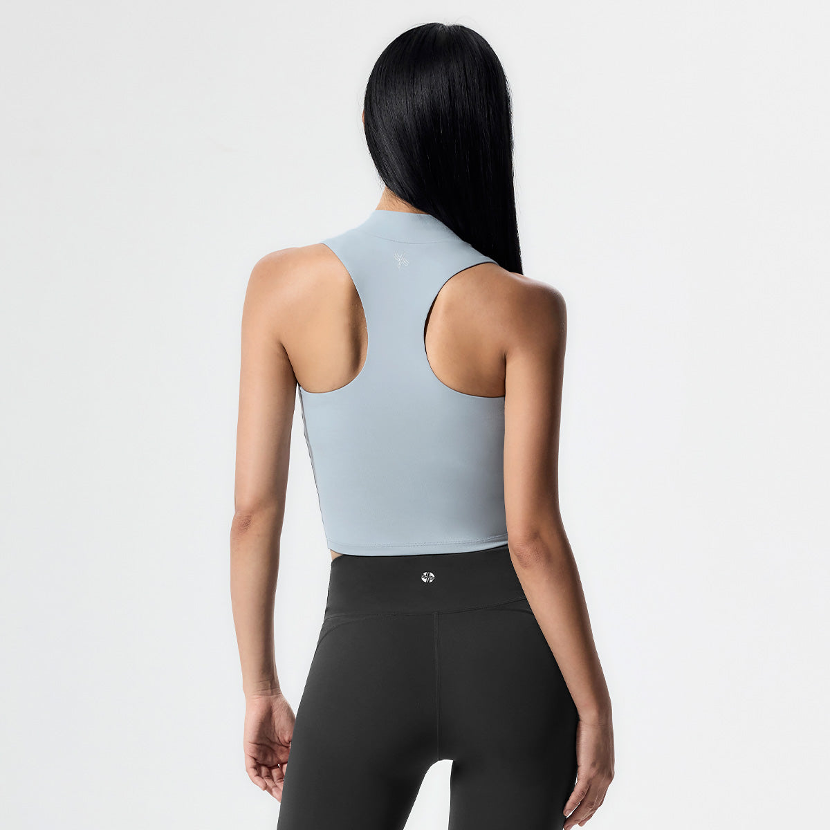The racerback structure supports a full range of motion while allowing clear visibility of muscle activity during exercise.