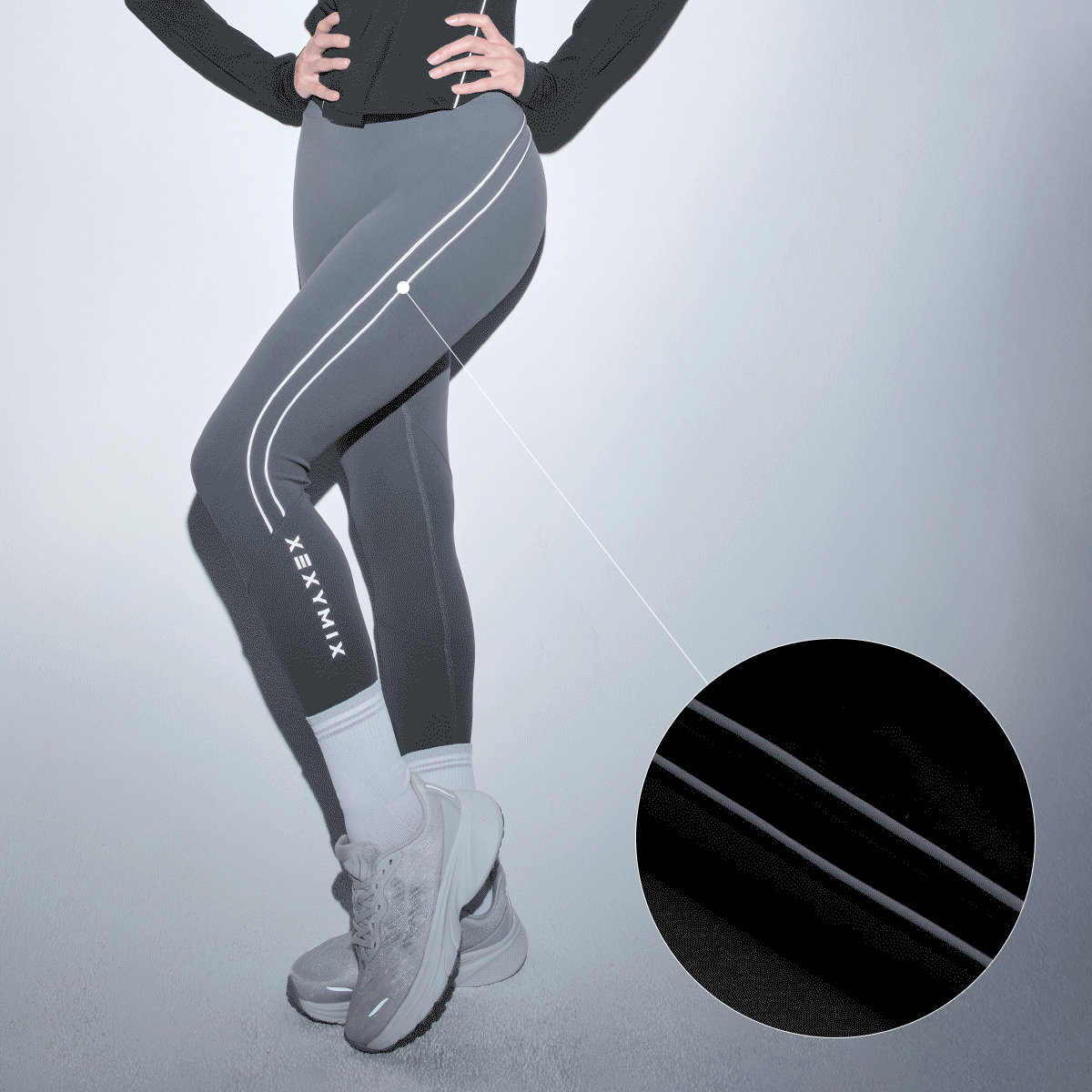 Curved double reflective piping from the hip to the side line enhances an active, dynamic look while offering a visually slimming effect.