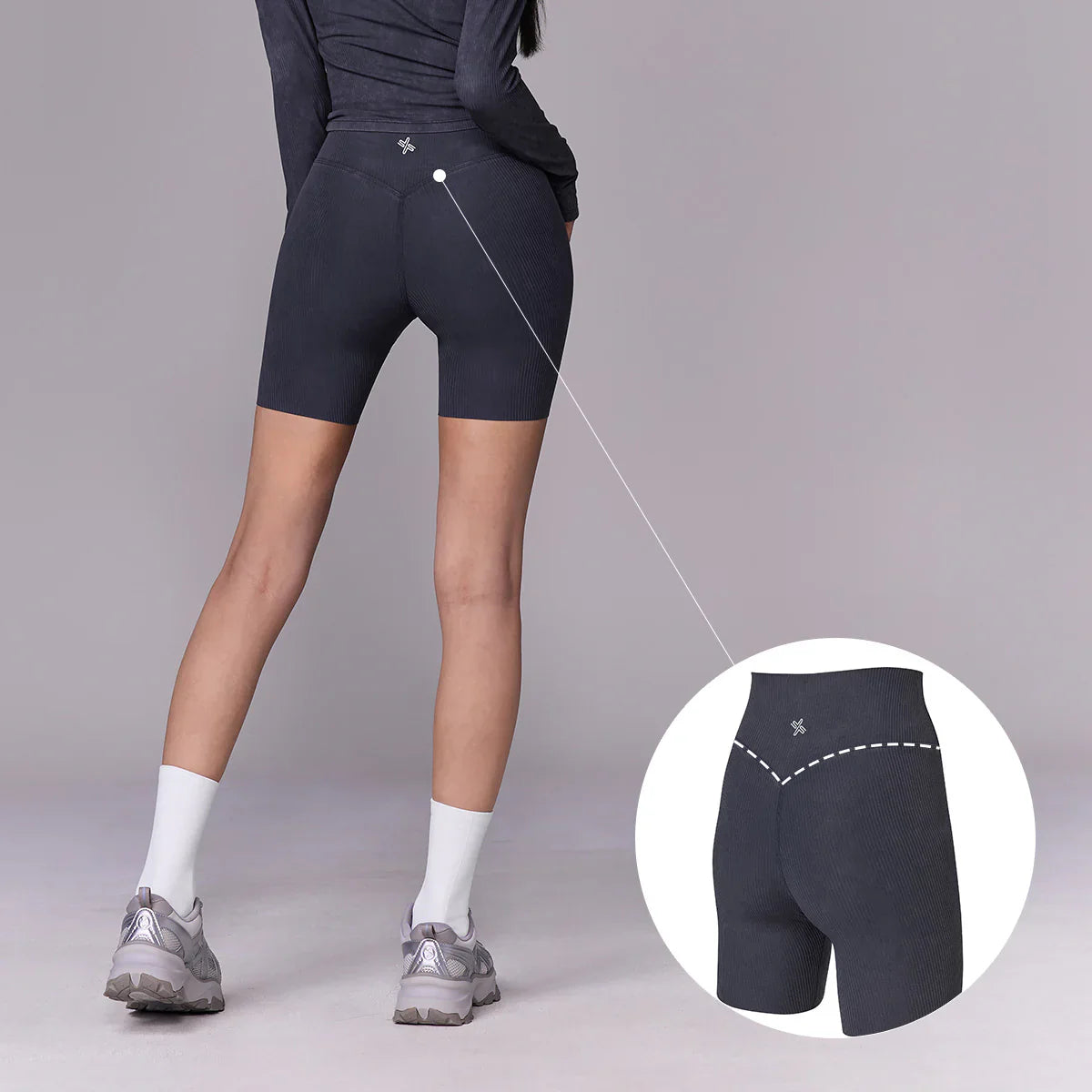 The V-shaped back seam enhances the hip line, creating a subtle lifted and sculpted appearance.
